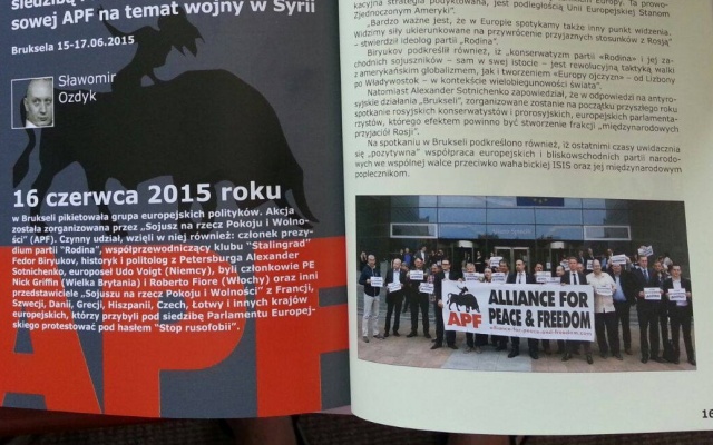 Напомним, "Альянс за мир и свободу" поддерживает сотрудничество с Всероссийской политической партией "РОДИНА". Летом 2015 года член Бюро Президиума "РОДИНЫ" Фёдор Бирюков принял участие в серии мероприятий APF в Брюсселе, в частности, в акции "Остановите русофобию" у входа в Европарламент. Также российский политик вместе с представителями APF посетил Кипр, где Народный национальный фронт (E.LA.M.) проводил ежегодные митинги и шествия против турецкой оккупации северной части острова.