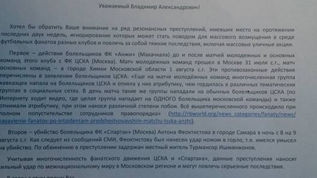 "Противозаконные действия перечислены в заявлении болельщиков ЦСКА: "Ещё на матче молодёжных команд многочисленная группа кавказцев напала на болельщиков ЦСКА и отняла у них атрибутику, чем гордилась в различных тематических группах в социальных сетях. В день матча такие же группы нападали на обычных болельщиков ЦСКА (по интернету ходит видео, где целая группа нападает на одного болельщика московской команды) и также отнимали атрибутику, при этом нанося различной степени побои. Всё вышеперечисленное происходило при полном попустительстве сотрудников правопорядка", - говорится в обращении Лактюшина.