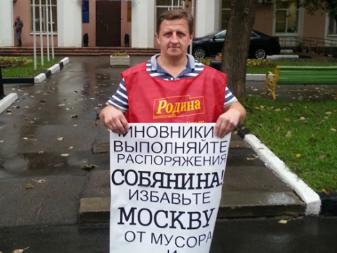 Сегодня, 4 сентября, активисты Московского отделения партии "РОДИНА" провели серию одиночных пикетов в пяти округах столицы. Лозунг пикетов: "Чиновники! Выполняйте распоряжения Собянина, избавьте Москву от мусора и нелегалов".